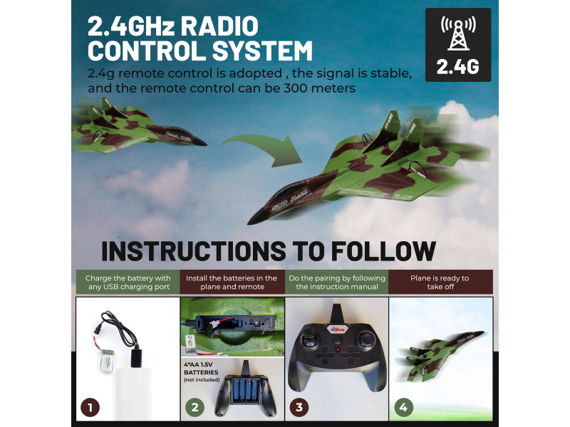 ✔ 2.4GHz radio control system With a range of up to 300m, the remote control allows movement on two axes: up/down and left/right. Several planes can fly together without mutual confusion.